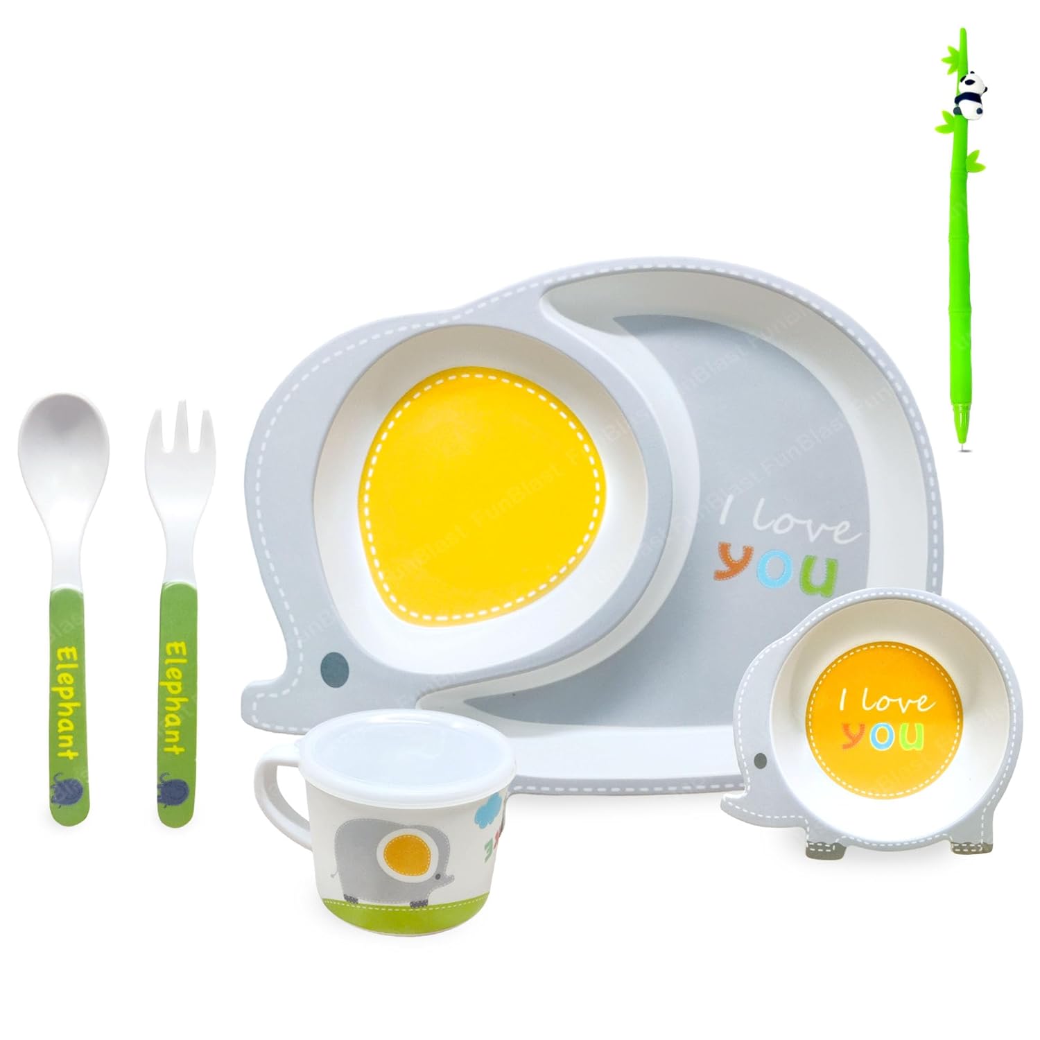 Bamboo Fiber Feeding Tableware Set for Kids – Elephant Design Bamboo Fiber Plate, Bowl, Cup, Spoon and Fork Kids