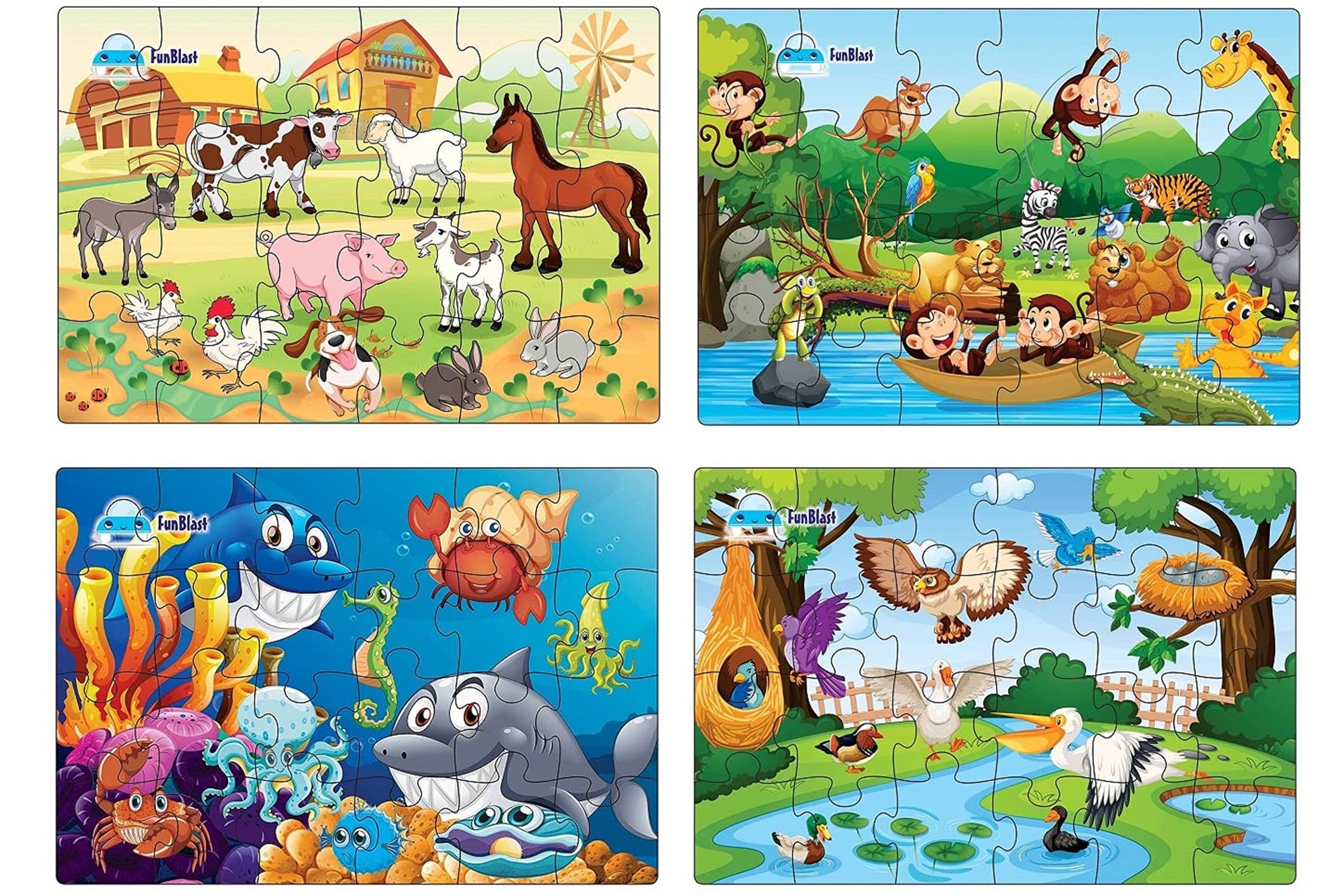 • SAFE & DURABLE – This FunBlast 4 in 1 Jigsaw Puzzle for Kids is made from reusable card board and without any sharp edges so that children can grasp it safely. The pieces are of high quality to endure a toddler’s handling.