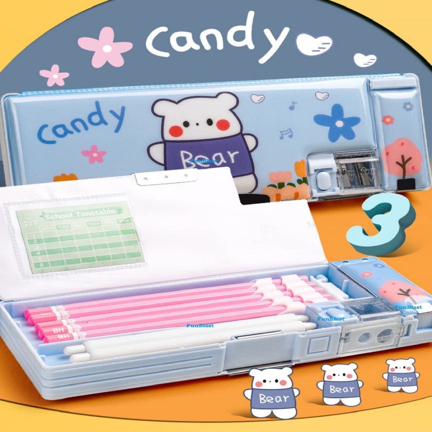 • Cartoon Pencil Box: This unique box can accommodate all the necessary stationery that your child would need to carry to school with separate slots for pencil, rubber, eraser, geometric set