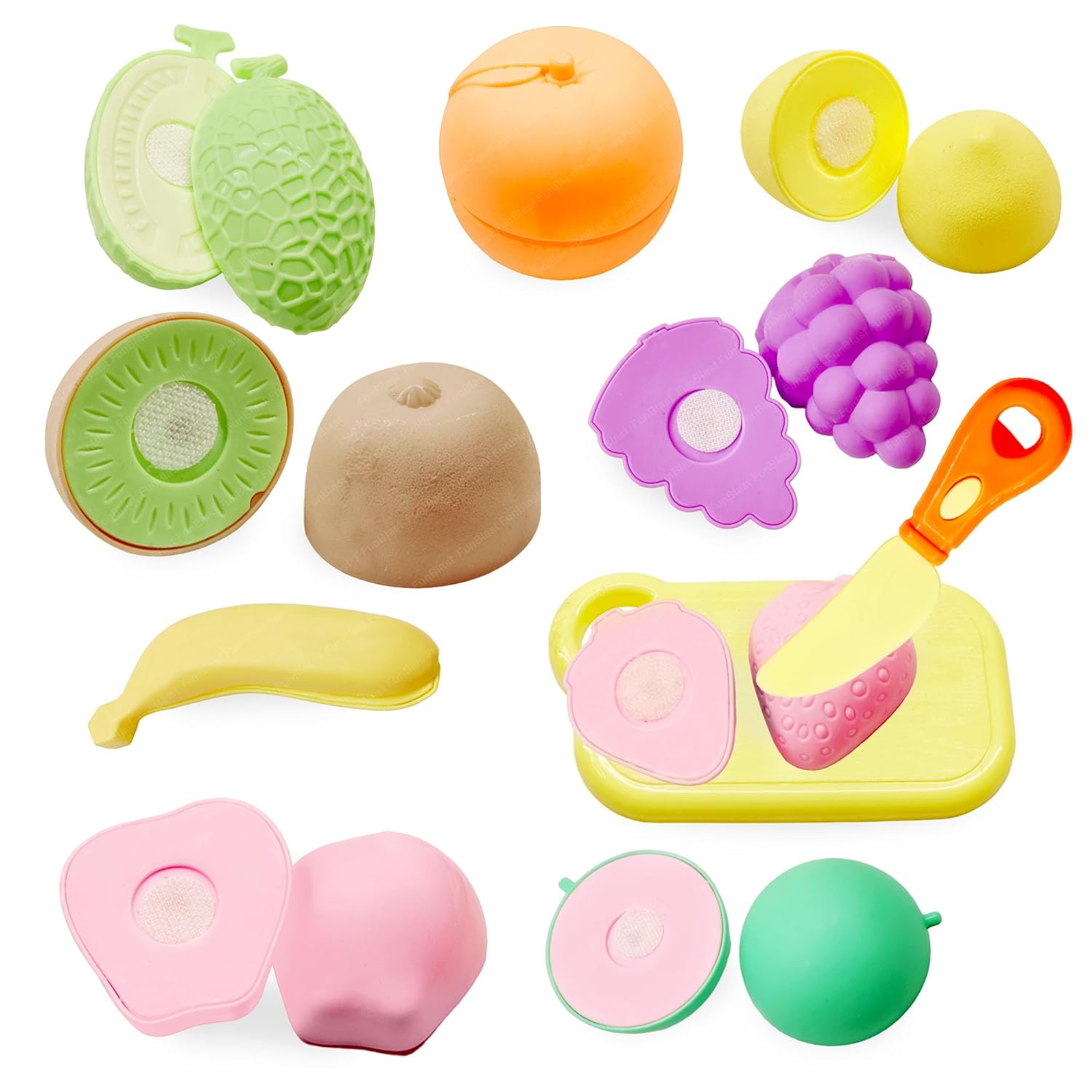 • 12 PCS FOOD TOY SET: FunBlast realistic fruit toy set Includes- apple, strawberry, banana, orange, lemon, grapes, guava, knife & chopping board etc.