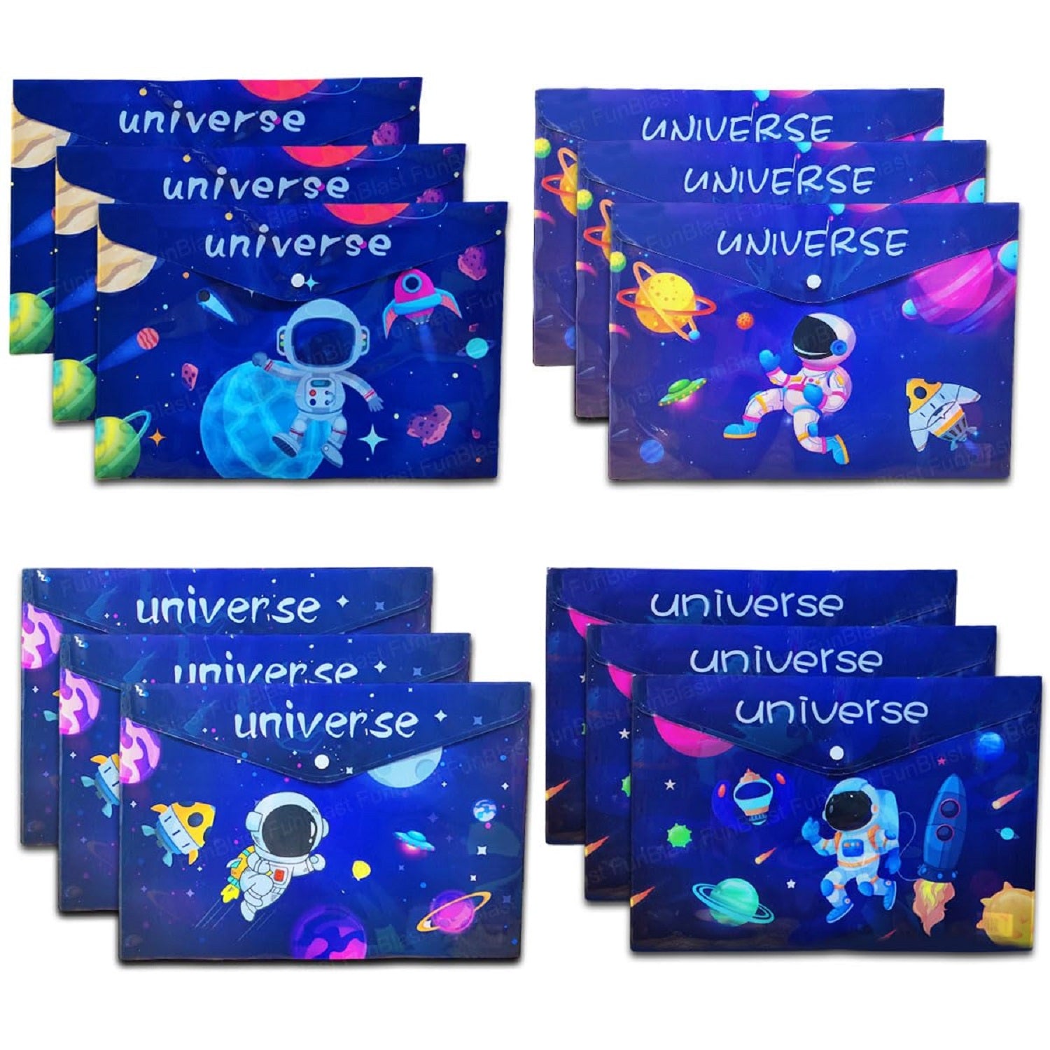 Space Astronaut File Folder with Button Lock – Pack of 12 Pcs Space Theme Certificates Holder, A4 Size Document Organizer Bag - Assorted Design