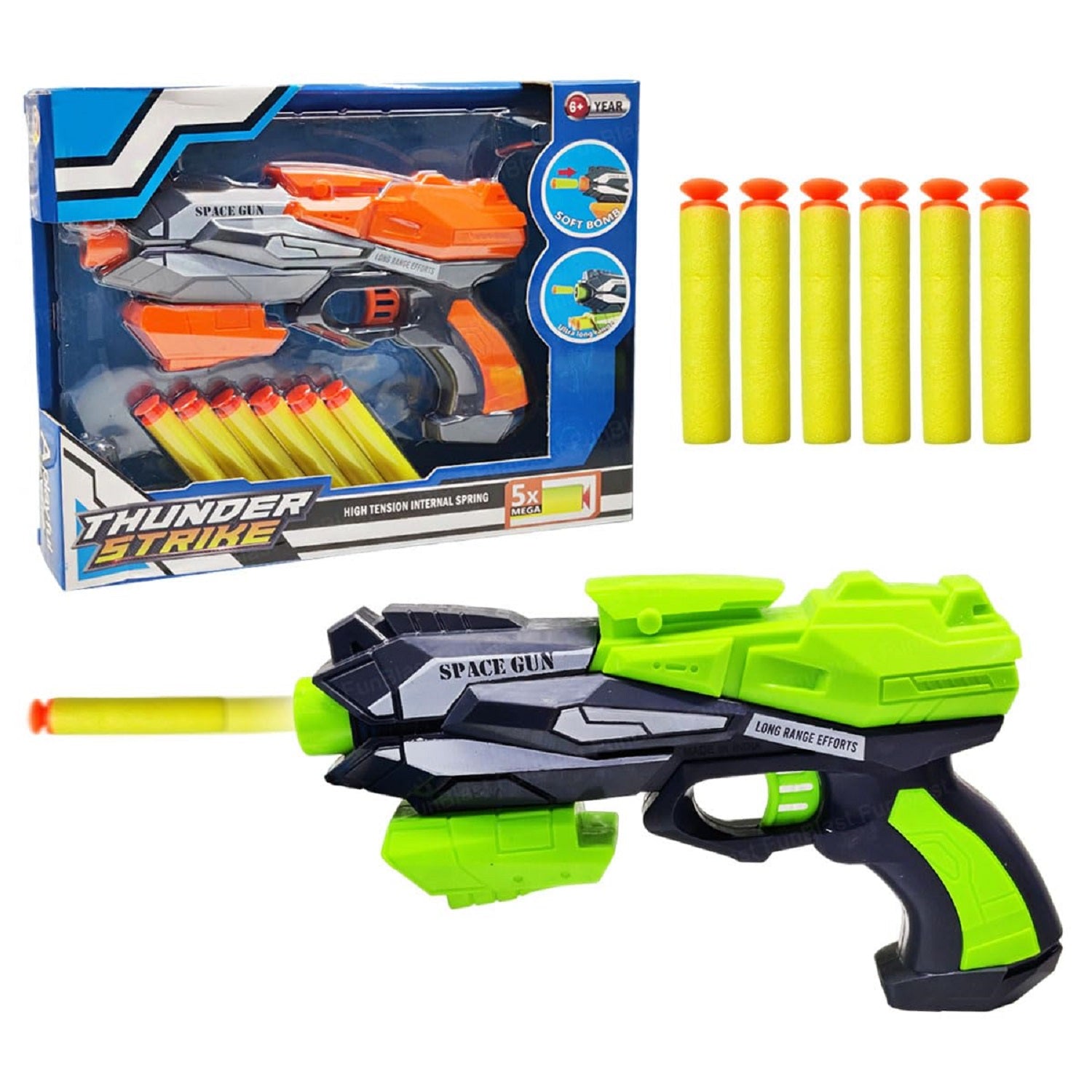 • FunBlast high speed manual soft bullet gun set comes with 1 blaster pistol, 6 soft foam bullets