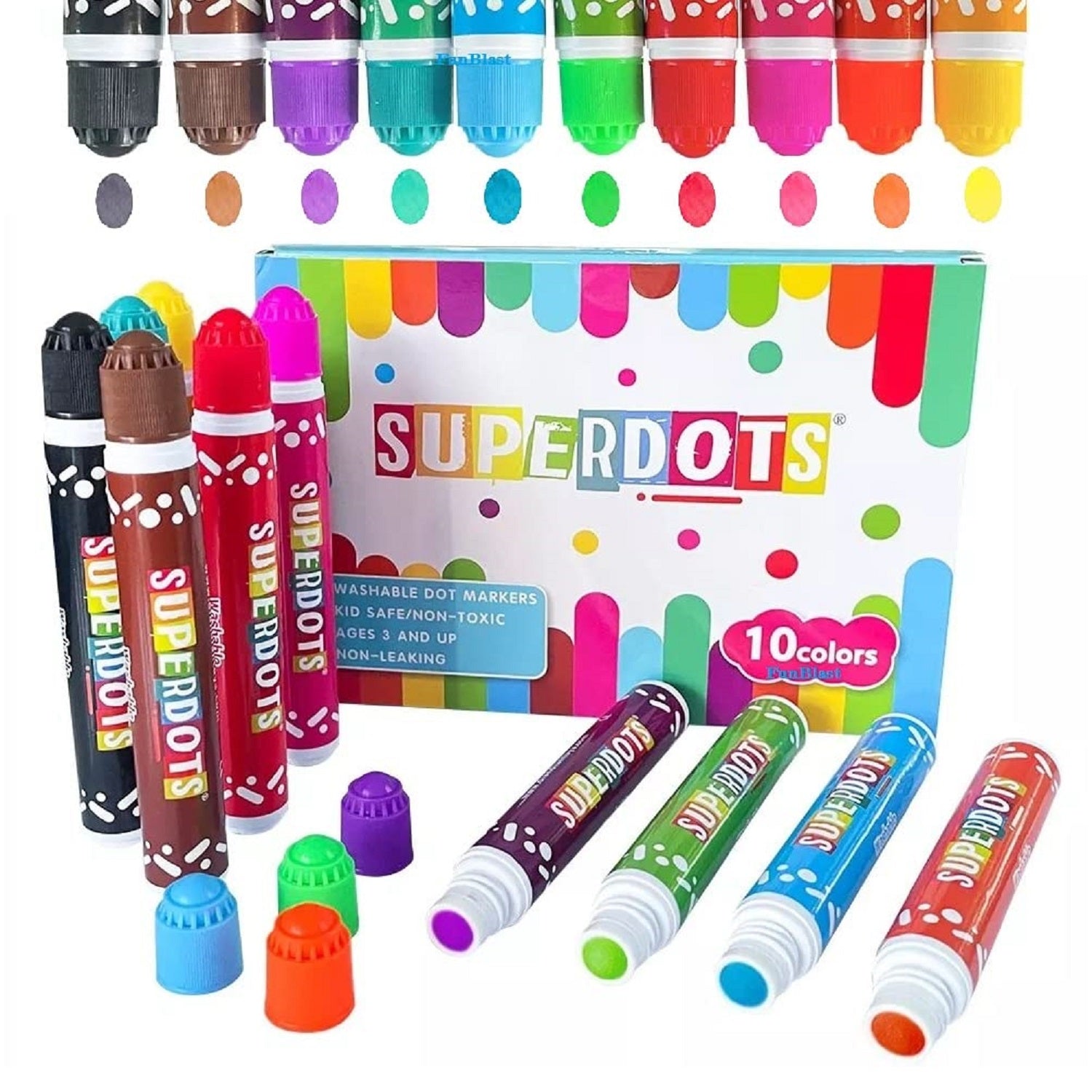 • Set of 10 Washable Markers – FunBlast washable dot markers includes 10 colors in a packet, perfect painting tool for children without a mess unlike traditional brushes, paints etc fully washable